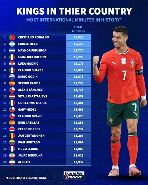 直播吧11月13日讯德国转会市场列出了国家队出场时间排名,C罗居首,梅西次席。