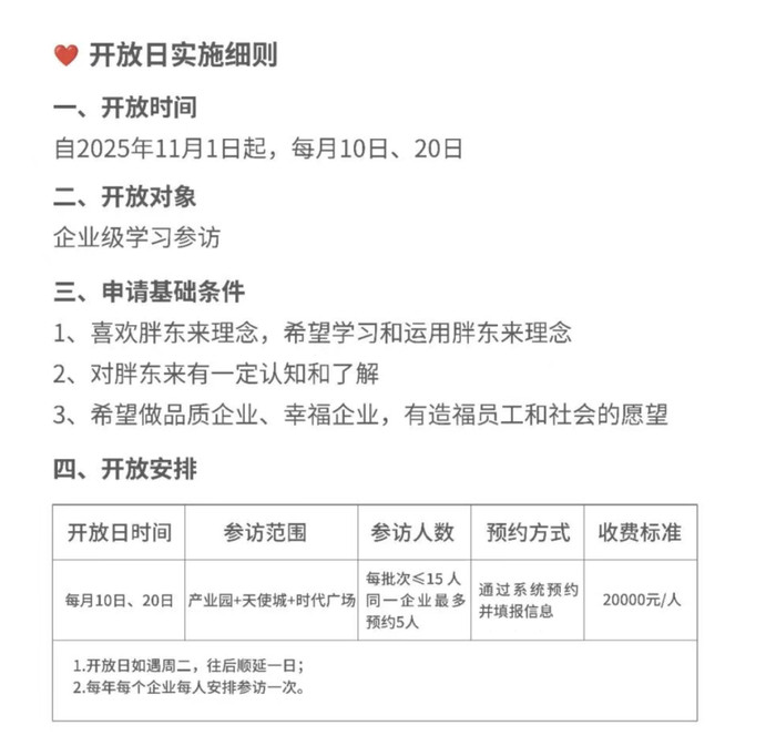 10月20日,胖东来商贸集团宣布设立开放日,自2025年11月1日起,每月10日、20日面向企业级学习参访开放,收费标准2万元/人。