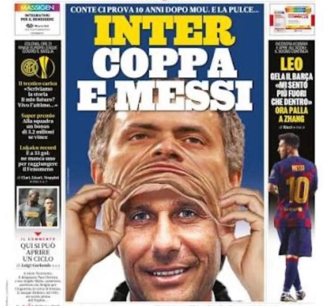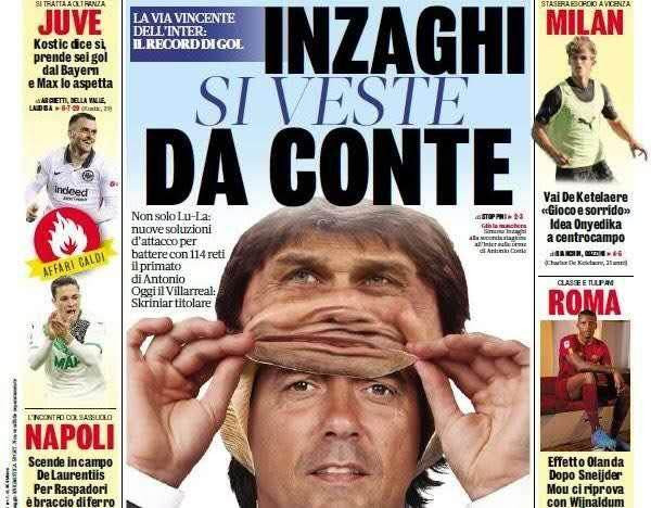 《米兰体育报》有一个可怕的“传统”,只要国际米兰的新旧教头之间有继承关系,编辑部就会发力,把“老人”做成一具皮囊,套在现任的头上。意思都明白,却总是呈现出一种“画皮”的恐怖感。穆里尼奥带着埃雷拉的面具,孔蒂套着穆里尼奥的皮囊,小因扎吉成为孔蒂的分身,如今终于轮到了齐沃。在9月25日这期的头版上,小因扎吉也被做成“标本”,被套在了齐沃的头上。