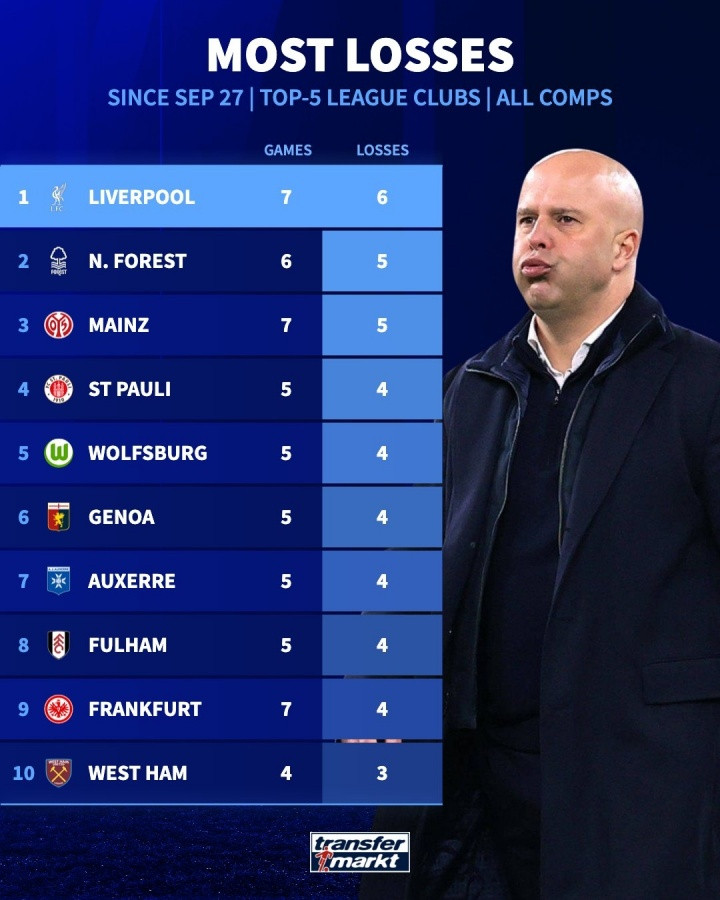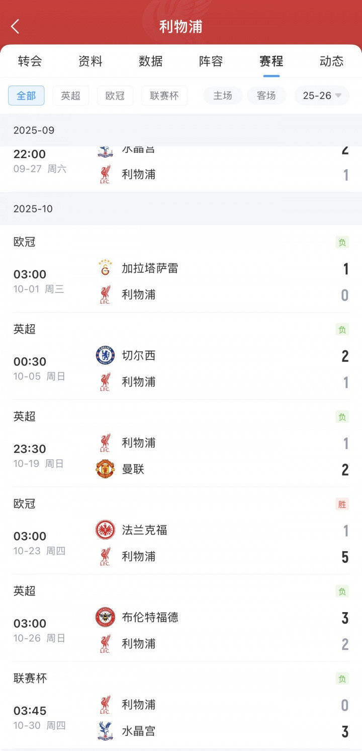 直播吧10月30日讯利物浦0-3不敌水晶宫,各项赛事仅7场比赛1胜6负,数据统计显示,利物浦是同一时期五大联赛所有球队中输球场次最多的。